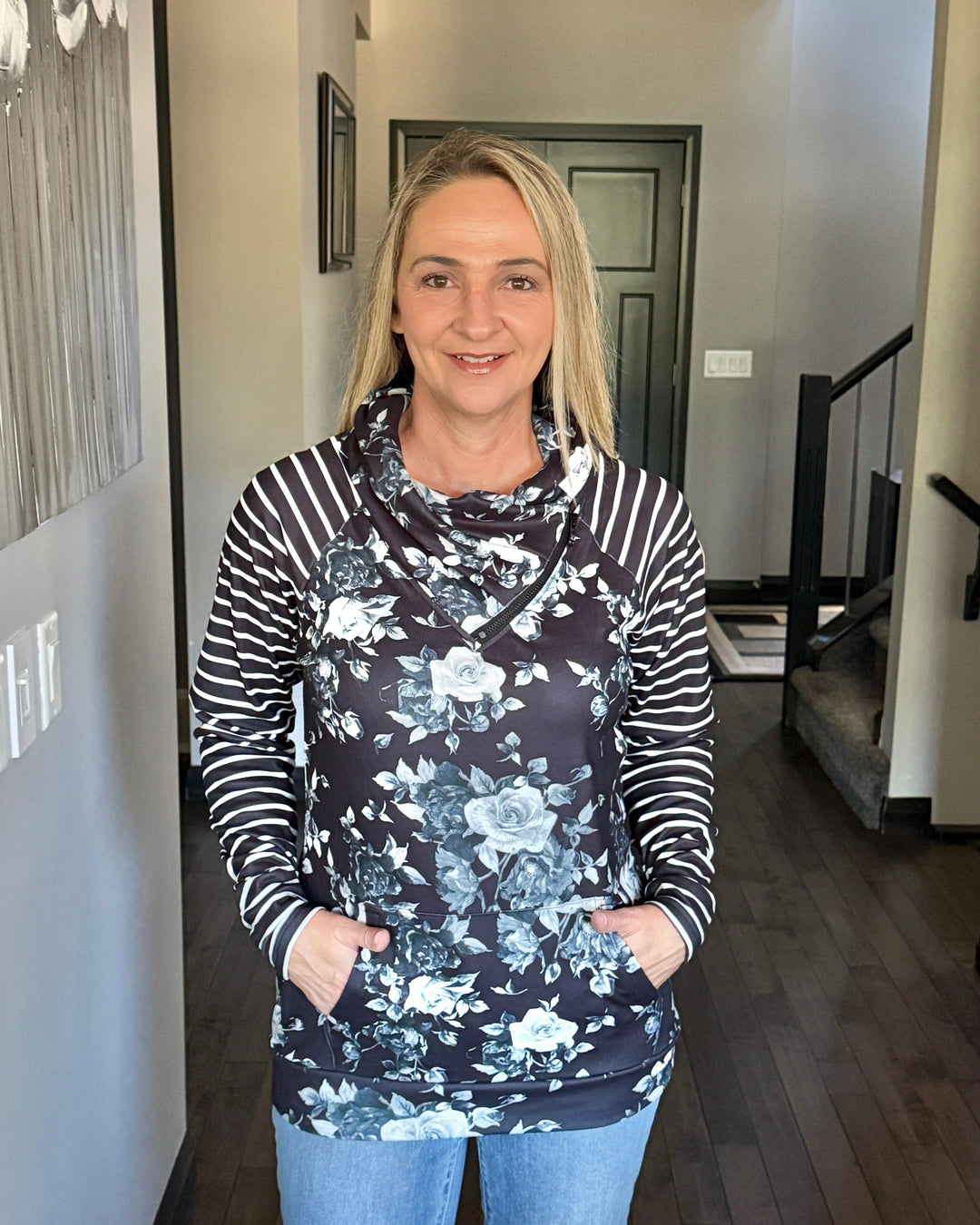 Michelle Mae | Zoey ZipCowl Sweatshirt | Black Floral & Stripes