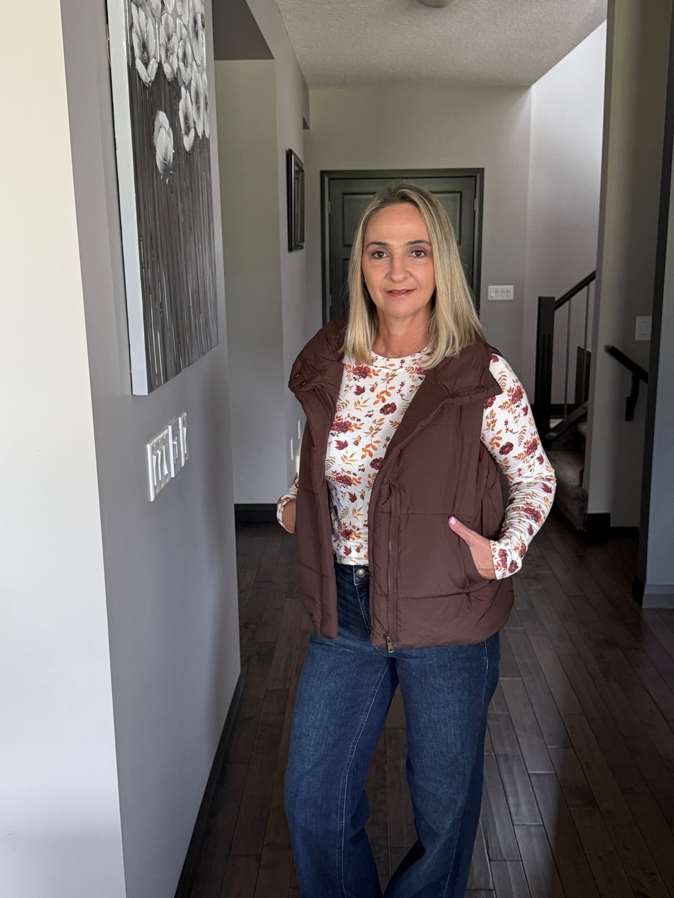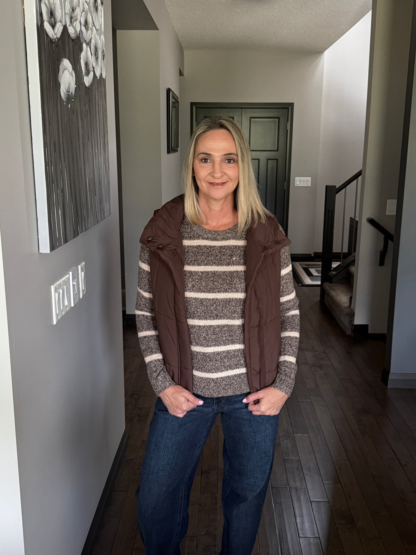 Fit: True to size; Claire wears a small for a comfortable fit; Claire is able to zip up the small comfortably over a thin tee or sweater