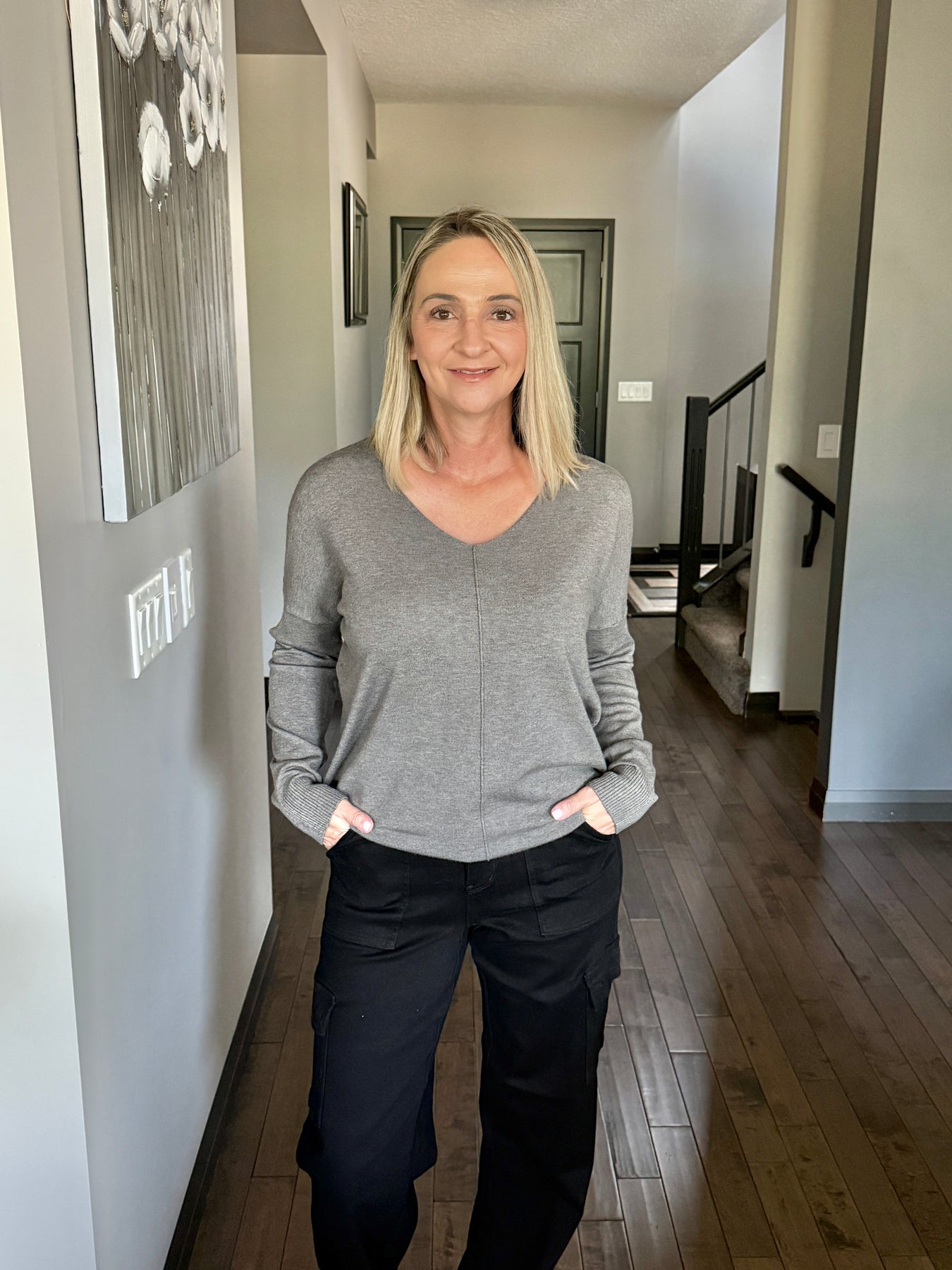 Fit:  Oversized / Generous;  Claire is a true size small and wears the S/M for a very relaxed, oversized fit;